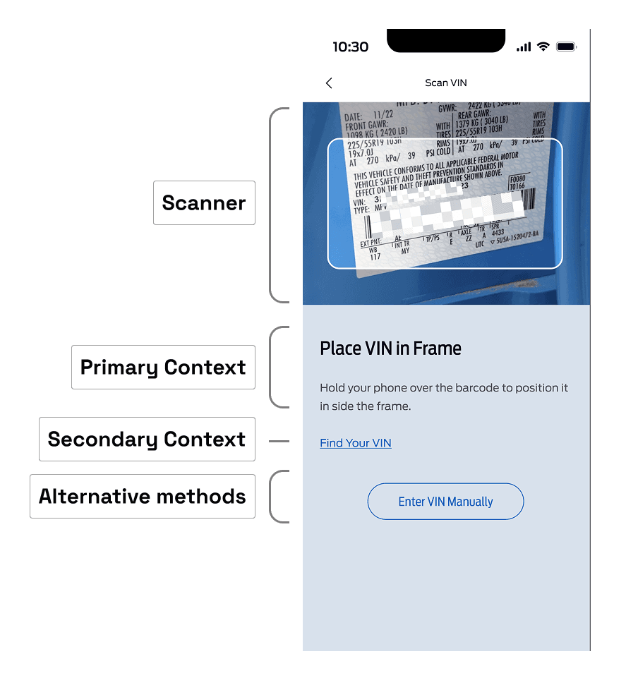 By allocating one-third of the screen to the VIN scanner, we were able to use the remaining two-thirds for primary and secondary contextual text and supporting links, guiding users more effectively to complete their tasks.